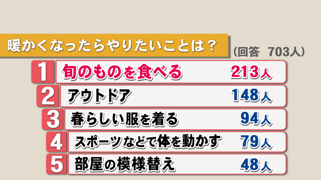 また「暖かくなったらやりたいことは?」の質問に対しては、「旬のものを食べる」との回答が最も多く寄せられました。