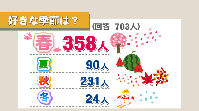 好きな季節について質問したところ、半数以上の358人が「春」と回答しています。