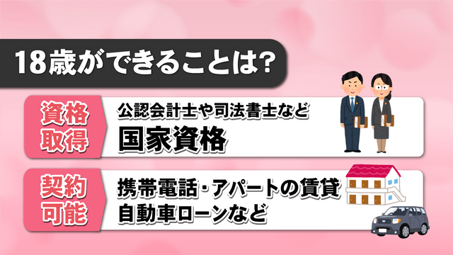公認会計士や司法書士などの国家資格の取得。そして、親の同意なしで「契約行為」ができるようになり、携帯電話の契約やアパートの賃貸契約、自動車ローン契約などが可能になります。