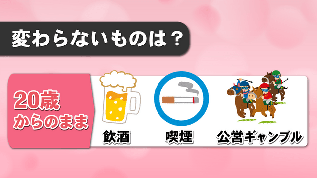 一方、成人年齢が下がっても変わらないものもあります。飲酒や喫煙、競馬などの公営ギャンブルなどは「20歳から」のままです。