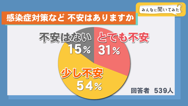 まず、「感染症対策など不安はありますか?」という問いには、回答があった539人のうち、「とても不安」「少し不安」と回答した人が85%、「不安はない」が15%という結果になりました。