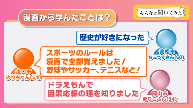「漫画から学んだことはあるか」という質問には、「歴史が好きになった」や「スポーツのルールは漫画で全部覚えました!」という声が寄せられました。中には、「ドラえもんで因果応報の理を知りました」という意見もありました。
