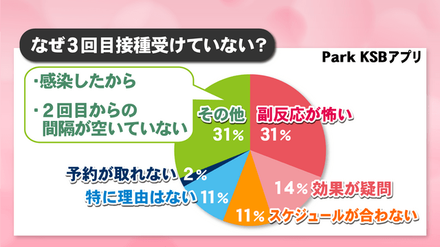 Park KSBアプリでワクチンの3回目接種を受けていないという人に理由を聞いてみたところ、「副反応が怖い」が約3割、次いで「効果に疑問」という声が多くなりました。