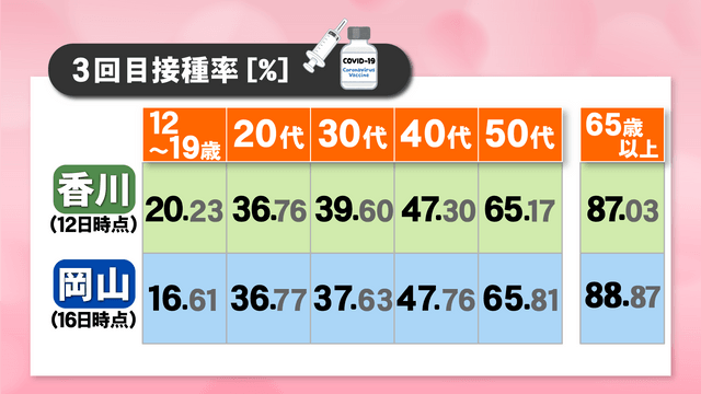 岡山・香川の年代別の3回目接種率はいずれも65歳以上の高齢者は80%代後半と高くなっていますが、その他は年代が下がるごとに接種率も下がっています。