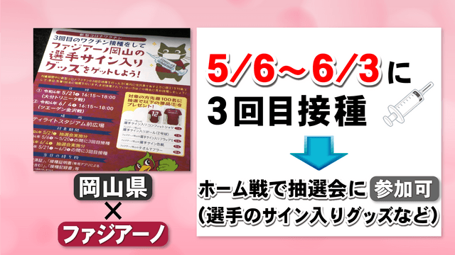 そんな中、岡山県は若者の接種を進めようとファジアーノと連携した取り組みを行っています。対象期間に3回目のワクチン接種をした人は、ホーム戦で選手のサイン入りグッズなどが当たる抽選会に参加できるというものです。
