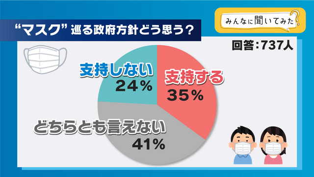 今回、Park KSBアプリではマスク着用に関する政府の方針について聞いてみたところ、方針を「支持する」が35%、「支持しない」が24%、「どちらとも言えない」が41%となりました。