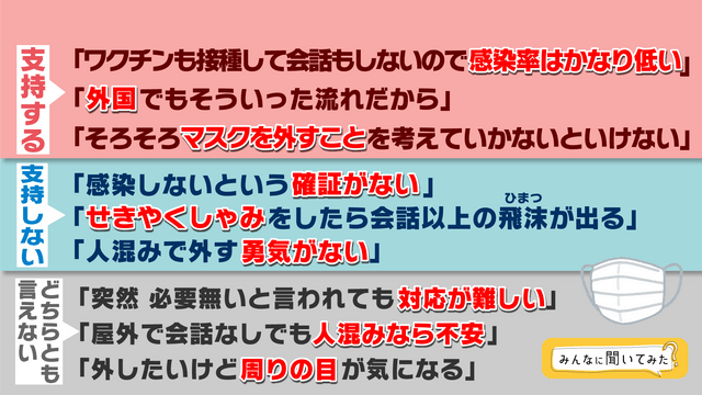 専門家から「マスクの着用」について見直しが提案される中、5月20日、厚生労働省が新たな見解を発表しました。今後もマスクを着けるか、それとも外すか。街の皆さんの声を聞きました。