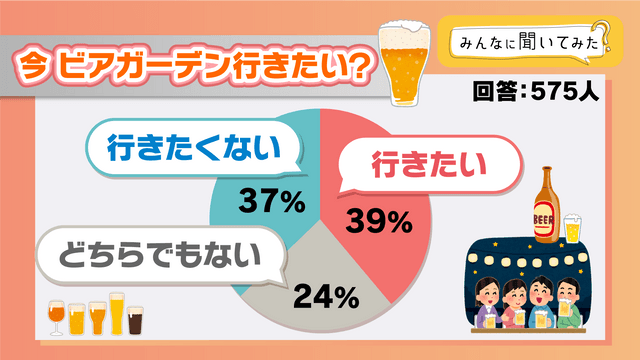 Park KSBアプリでは「今、ビアガーデンに行きたいか」を皆さんに聞いてみました。すると、「行きたい」が39%、「行きたくない」が37%、「どちらでもない」が24%という結果になりました(回答:575人)。