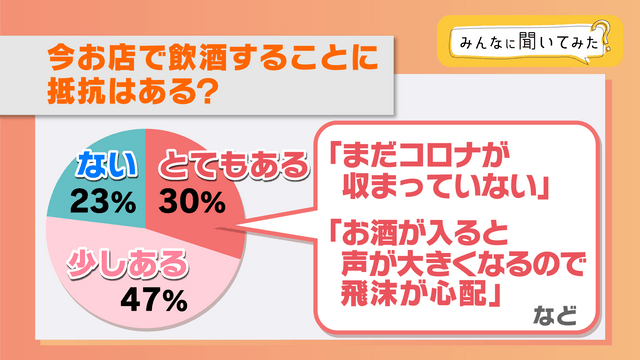一方、「今、お店で飲酒することに抵抗はあるか?」という質問には、77%の方が「とても」または「少しある」と答えました。