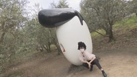 リーゼントのかつらを被って瀬戸芸の作品の前で記念写真♪(香川・小豆島町)