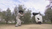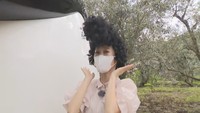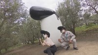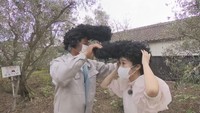• リーゼントのかつらを被って瀬戸芸の作品の前で記念写真♪(香川・小豆島町)