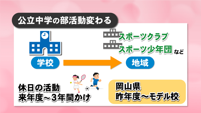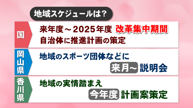 国は2023年度から2025年度を「改革集中期間」として各自治体に推進計画の策定を求める方針です。岡山県は休日の指導をお願いする地域のスポーツクラブ、スポーツ団体に対し、7月から説明会を開く予定です。