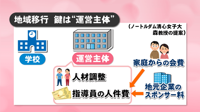 森教授は、学校とは別の運営主体を作った上で人材の調整や人件費などを工面する必要があると指摘しています。