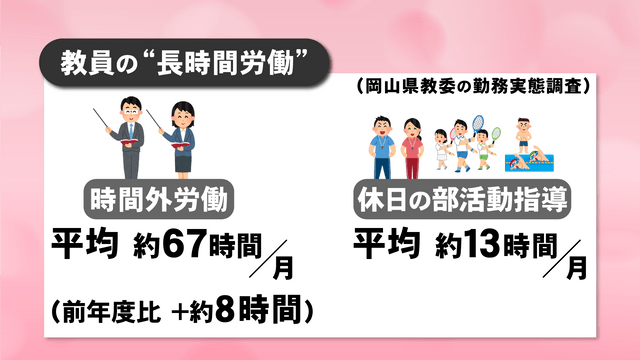 岡山県教委が2021年度に行った勤務実態調査によると、中学校教員の1カ月の時間外業務、いわゆる残業は平均で67時間。前の年度より約8時間増えました。
