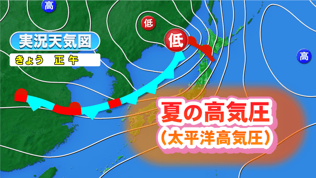 暑さの原因は「夏の高気圧」である太平洋高気圧です。梅雨前線が北上していて梅雨明けのような天気図になっています。
