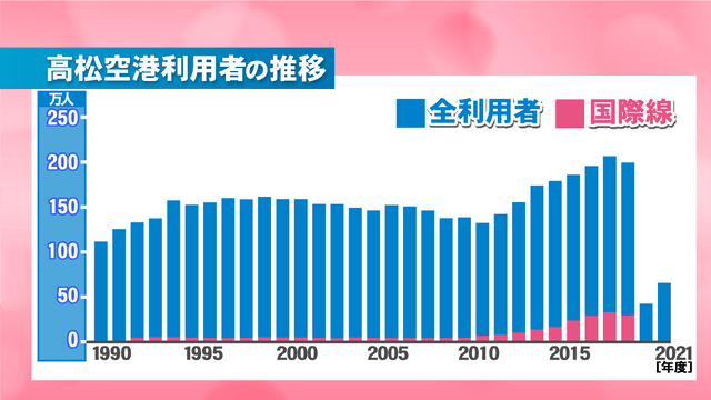 高松空港の利用者は、2018年度は200万人を超えて過去最多となりました。しかし、2020年度と2021年度は、新型コロナの影響を受けて、2018年度の5分の1から3分の1となりました。
