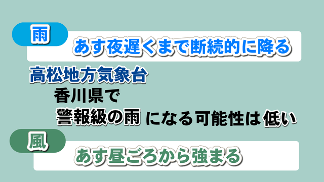 「風」は香川県で昼ごろから強まりそうですので、交通機関の乱れにはご注意ください。5日は気象情報をこまめにチェックしてください。