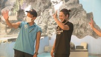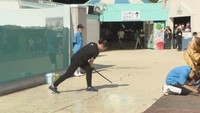 香川ファイブアローズの選手がイルカショーに登場(高松市屋島東町 24日)