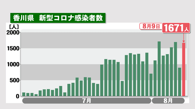 香川県で9日、新たに1671人の新型コロナウイルス感染が確認されました。1日当たりの感染者としては過去3番目に多く、前週の火曜日(2日)よりも552人増えました。