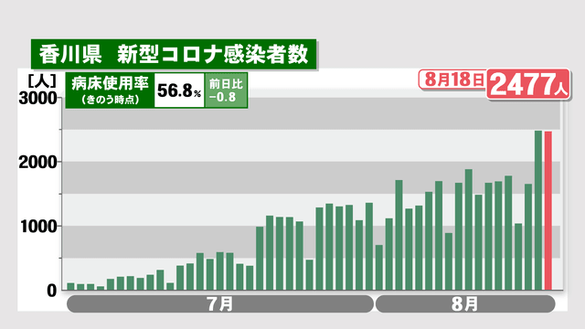1日あたりの新規感染者は、先週木曜日(11日)より997人増え、17日の2482人に次ぐ過去2番目の多さになりました。17日時点の香川県の病床使用率は56.8%でした。