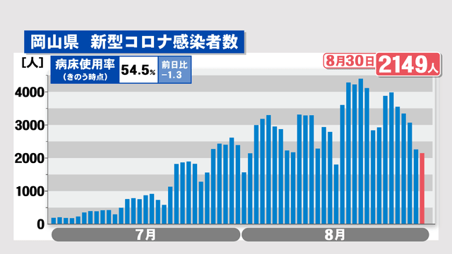 岡山県では30日、新たに2149人の新型コロナウイルス感染が発表されました。前の週の火曜日(23日)より800人近く減っています。