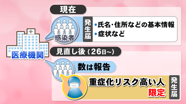 現在、医療機関は感染者全員分の氏名や住所、症状など情報を「発生届」として届け出ています。26日からは感染状況を把握するために感染者の「数」は報告するものの、氏名や住所などの「届け出」は高齢者など重症化リスクが高い人に限定します。