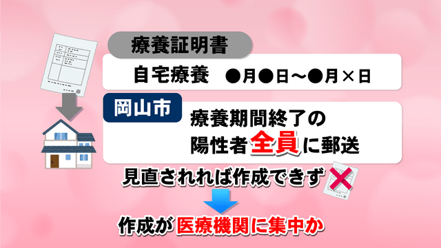 このほか、岡山市が課題にあげるのが「療養証明書」です。自宅療養がいつ始まっていつ解除されたかを記載したもので、岡山市の場合は療養期間が終わった陽性者全員に郵送しています。