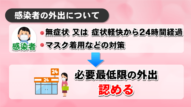 このほかにも感染者の外出について「無症状」もしくは「症状が軽くなってから24時間経過」した人はマスク着用などを条件に食料の買い出しなど必要最小限の外出を認めることを決めました。