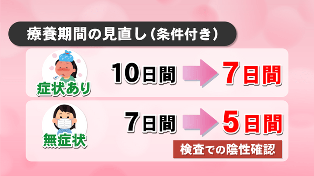 また政府は全数把握だけでなく、感染者の「療養期間」についても見直す方針を示しました。症状がある人は今の原則10日間から7日間に、症状のない人は検査での陰性を条件に7日間から5日間に短縮する方針を決めました。