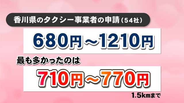 香川県の事業者が申請したのは、最も低いもので「680円」、高いもので「1210円」への値上げです。四国運輸局によると申請で最も多かったのは10%から20%の値上げ、つまり710円から770円の間を求めるものだったということです。