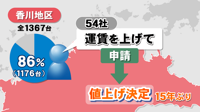申請したのは香川地区のタクシー車両1367台のうち86%を保有する54社。「総車両数の7割」という国の基準を超えたため、四国運輸局が検討した結果、「値上げが必要」と判断しました。