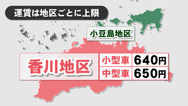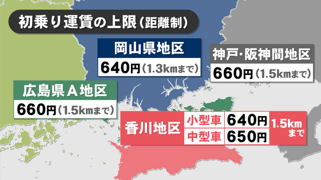改めて、現在の香川地区の初乗り運賃の上限は1.5kmまで小型車で「640円」、中型車で「650円」です。ちなみに神戸市を含む神戸・阪神間地区や広島市を含む広島県A地区は「660円」です。