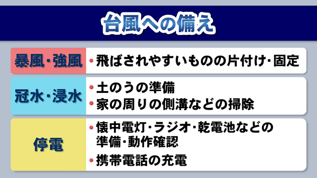 防災グッズを確認するなど早めに台風への備えをし、土砂災害や低い土地の浸水、河川の増水や氾濫、暴風に警戒してください。