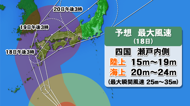それでも海上を中心に風が強まるおそれがあり、四国地方の瀬戸内側で18日に予想される最大風速は、陸上で15~19m、海上で20~24m、最大瞬間風速は陸上・海上ともに25~35mとなっています。交通機関への影響があるかもしれません。