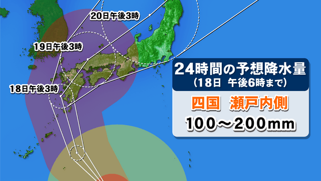 18日の午後6時までに予想される24時間降水量は、四国の瀬戸内側では多いところで100~200mmの見込みです。