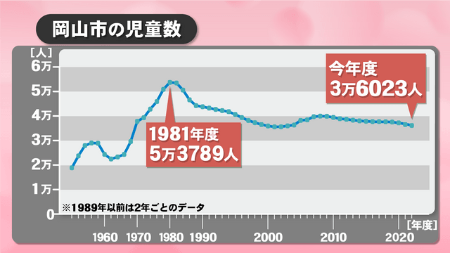 ここで岡山市全体の児童数の推移をみていきます。児童数は、団塊ジュニア世代の多くが小学校に入学した1981年度に過去最多の5万3000人余りとなりました。その後、減少していましたが、2008年度にかけて再び増加傾向に。これは団塊ジュニア世代の子どもたちが入学したころといわれています。