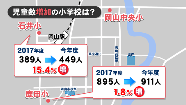 そうした中で岡山市中心部の学校、特に「鹿田小学校」と「石井小学校」はこの5年で児童数が増えています。鹿田は895人から911人で約2%。石井は389人から449人と15%以上の増加です。