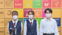 真庭市の太田市長に署名を渡す勝山高校と真庭高校の生徒会の代表6人