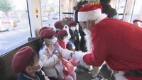 年末恒例「クリスマス電車」の運行始まる 出発式でサンタが園児にプレゼント 岡山電気軌道