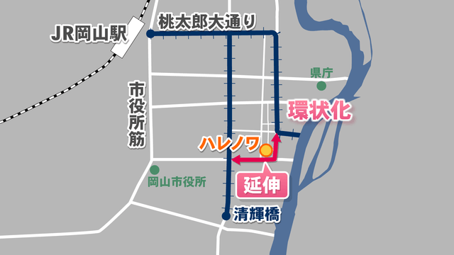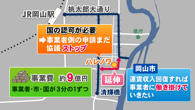 市は、ハレノワ近くの路線の延伸を早期に進めようとしていました。事業費9億円は、事業者と岡山市と国が3分の1ずつ負担する計画です。しかし、現在計画はストップしています。