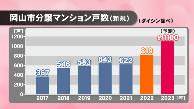 岡山市内の新築の分譲マンションの販売戸数は、2022年には819と、ここ数年でもっとも多くなりました。これが2023年は1100戸ほどになると予測されています。