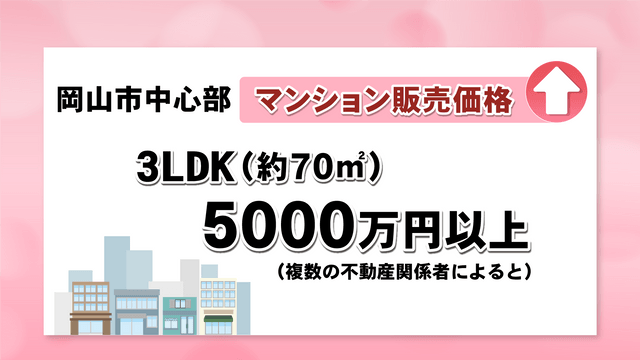 そして岡山市中心部では、マンションの販売価格が「上昇している」と言われています。複数の不動産関係者によると、市の中心部では、3LDK・70平方メートルで5000万円以上すると言われています。