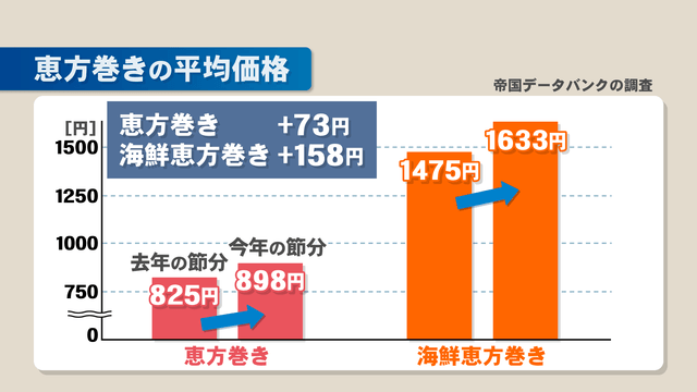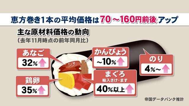 帝国データバンクによりますと、スーパーなど104社を対象とした調査では、恵方巻き1本の平均価格は2022年より70円~160円前後上がっているということです。