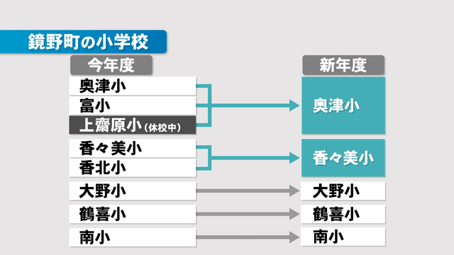 このうち鏡野町にある小学校は、8校から5校に減ります。上齋原小学校は、2020年度から休校していて、児童はすでに奥津小学校に通っています。