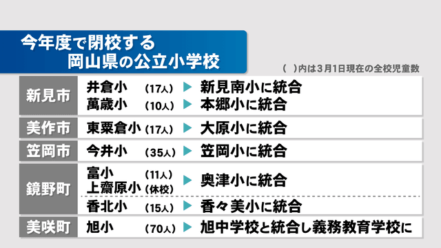 岡山県では2022年度、5つの市町で8つの公立小学校が閉校します。児童数の減少や、特色ある学校づくりに取り組むための再編などが、理由だということです。