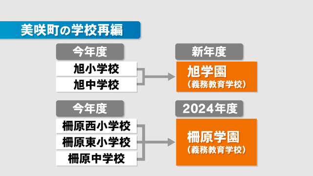 また、美咲町では小学校と中学校それぞれ1校を統合し、新年度から、小中一貫の義務教育学校がスタートします。さらに2024年度にも別の小中学校を再編し、義務教育学校が開校します。
