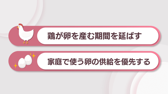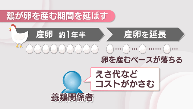 採卵用の鶏は1日1個のペースで1年半ほどの期間、卵を産みます。農林水産省は、卵を産ませる期間を延ばすことで流通する卵を増やそうとしています。一方、年を取った鶏は卵を産むペースが落ちるため、関係者からは餌代などのコストがかさむと懸念の声が上がっています。
