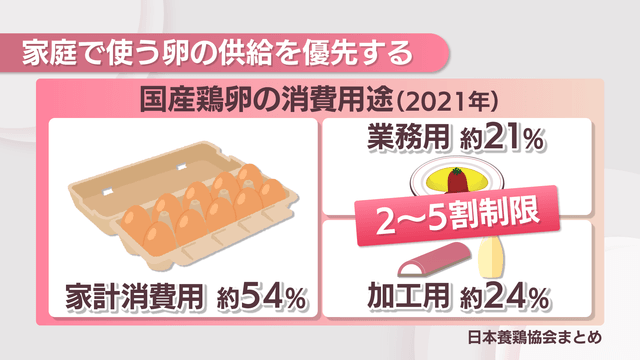 続いて「家庭用を優先する」という要請についてですが、日本で流通する卵の半数ほどは家庭で消費されています。このほか、飲食店などで使われる「業務用」とマヨネーズや練り物などの「加工用」がそれぞれ20%あまりとなっています。
