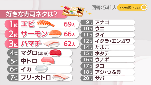 好きな寿司ネタは?【みんなに聞いてみた】 2023/4/27 18:15 みんなに聞いてみた ADVERTISEMENT ADVERTISEMENT 27日は、岡山理科大学で育てたマグロがゴールデンウィークに全国のくら寿司で提供されるというニュースをお伝えしましたが、Park KSBアプリでは皆さんに好きな寿司ネタを聞いてみました。 写真ページをみる