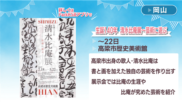 岡山の1位は、高梁市歴史美術館で開かれている「清水比庵展」です。清水比庵は高梁市出身の歌人で、書と絵画の技術も加えた独自の芸術を作り出しました。展示会では比庵の生涯や比庵が究めた芸術について紹介しています。
